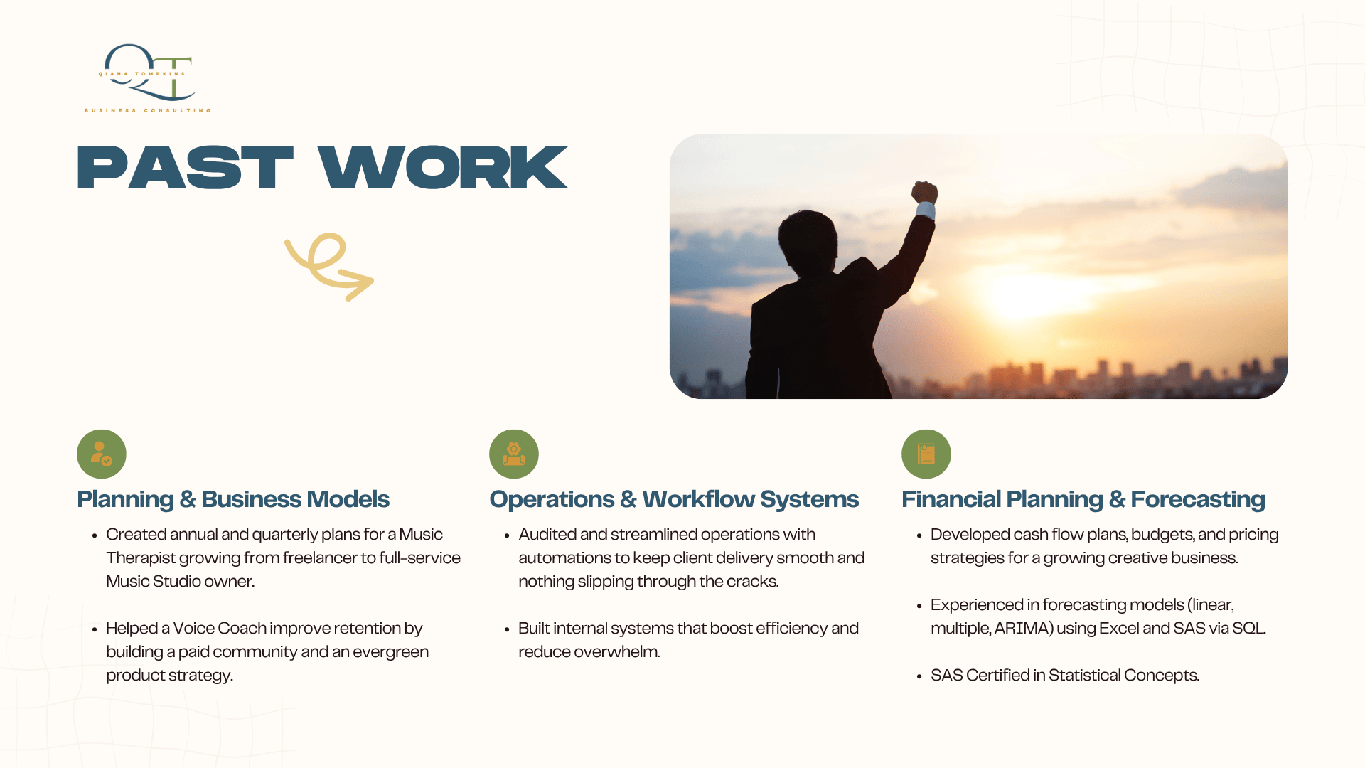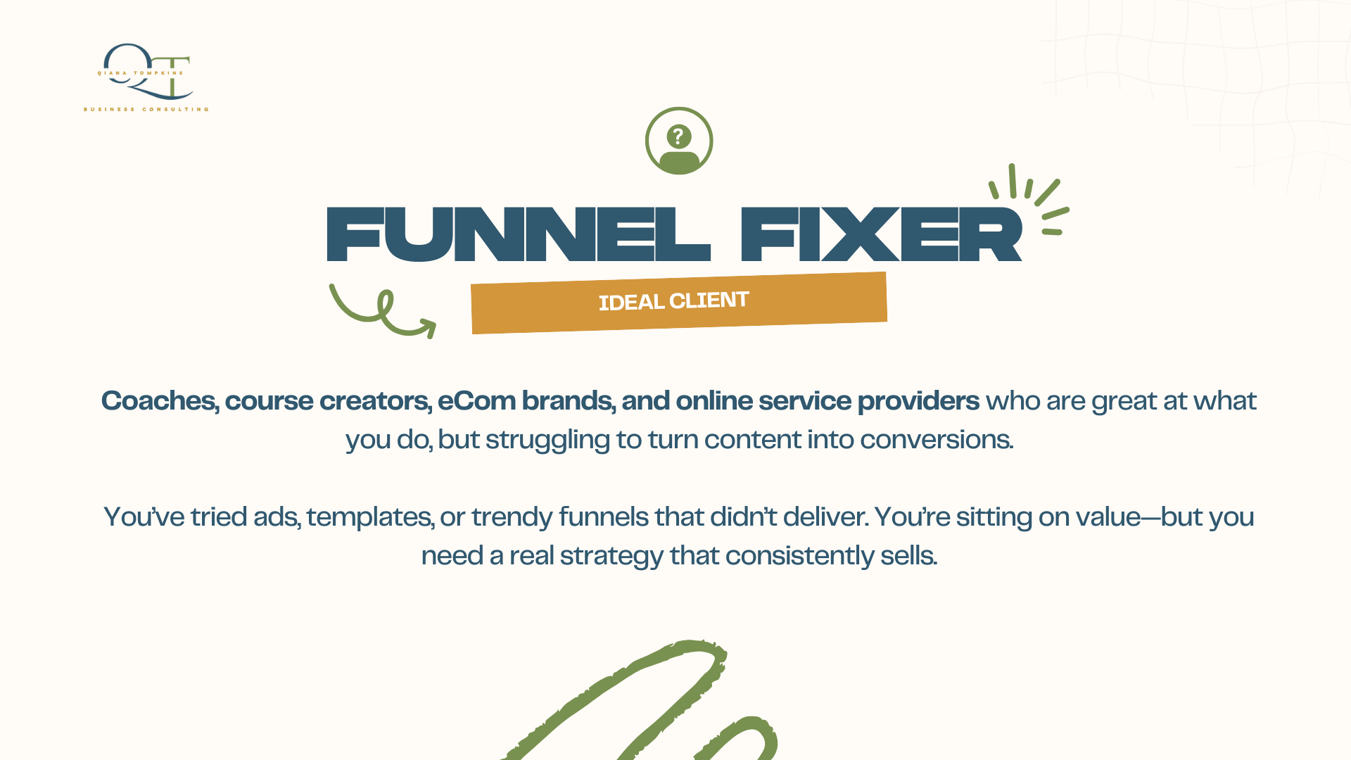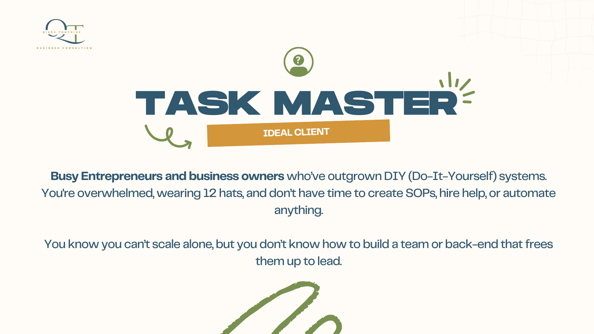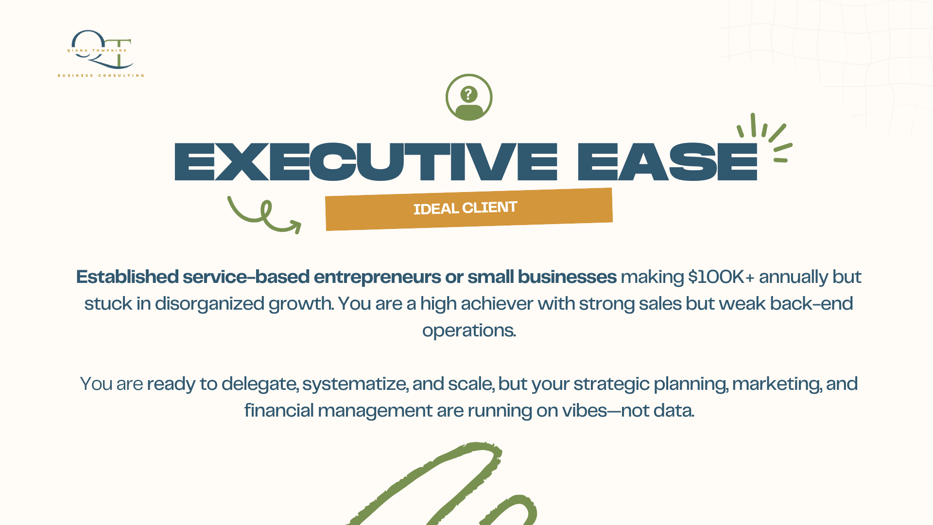 I specialize in helping e-commerce and service-based entrepreneurs like coaches, consultants, creatives, and experts, who are ready to scale without burning out. If you're tired of winging it and want a sustainable structure, you're my kind of client.