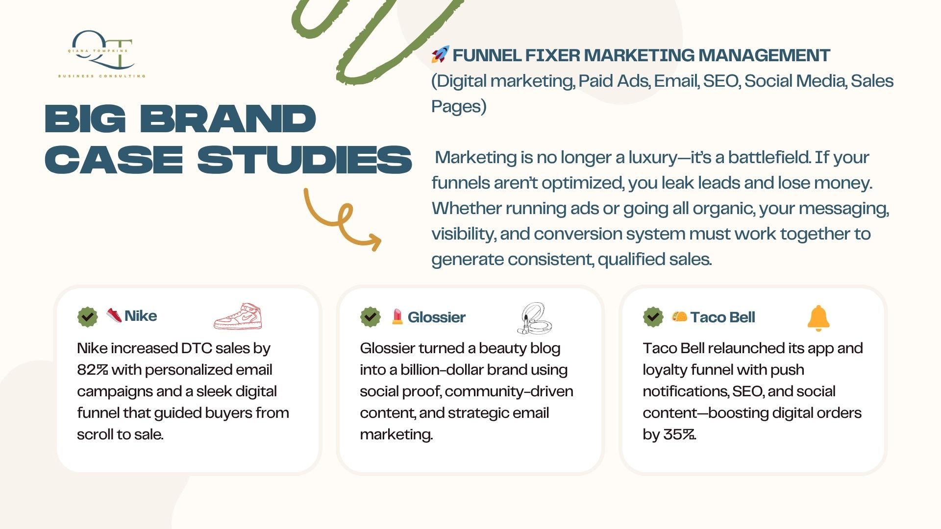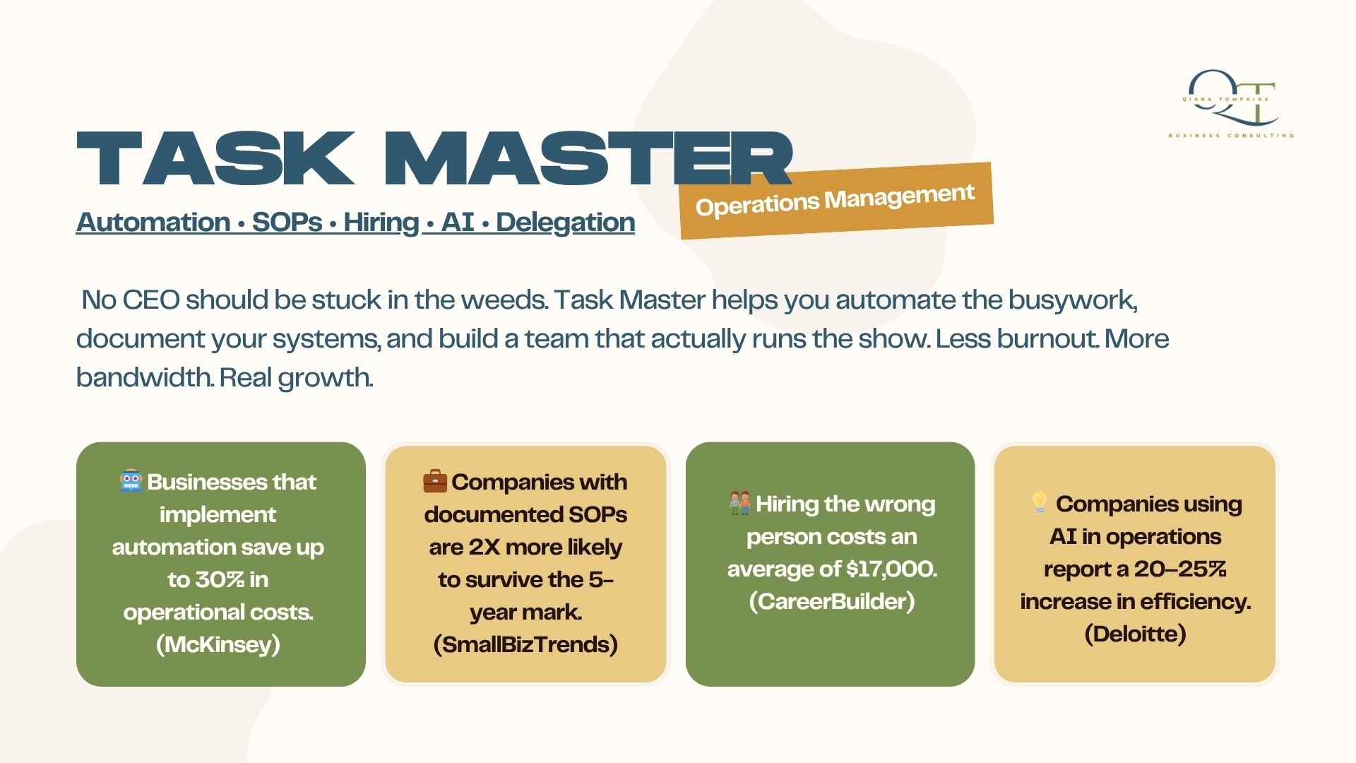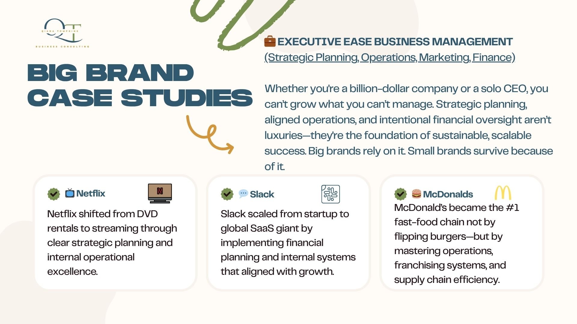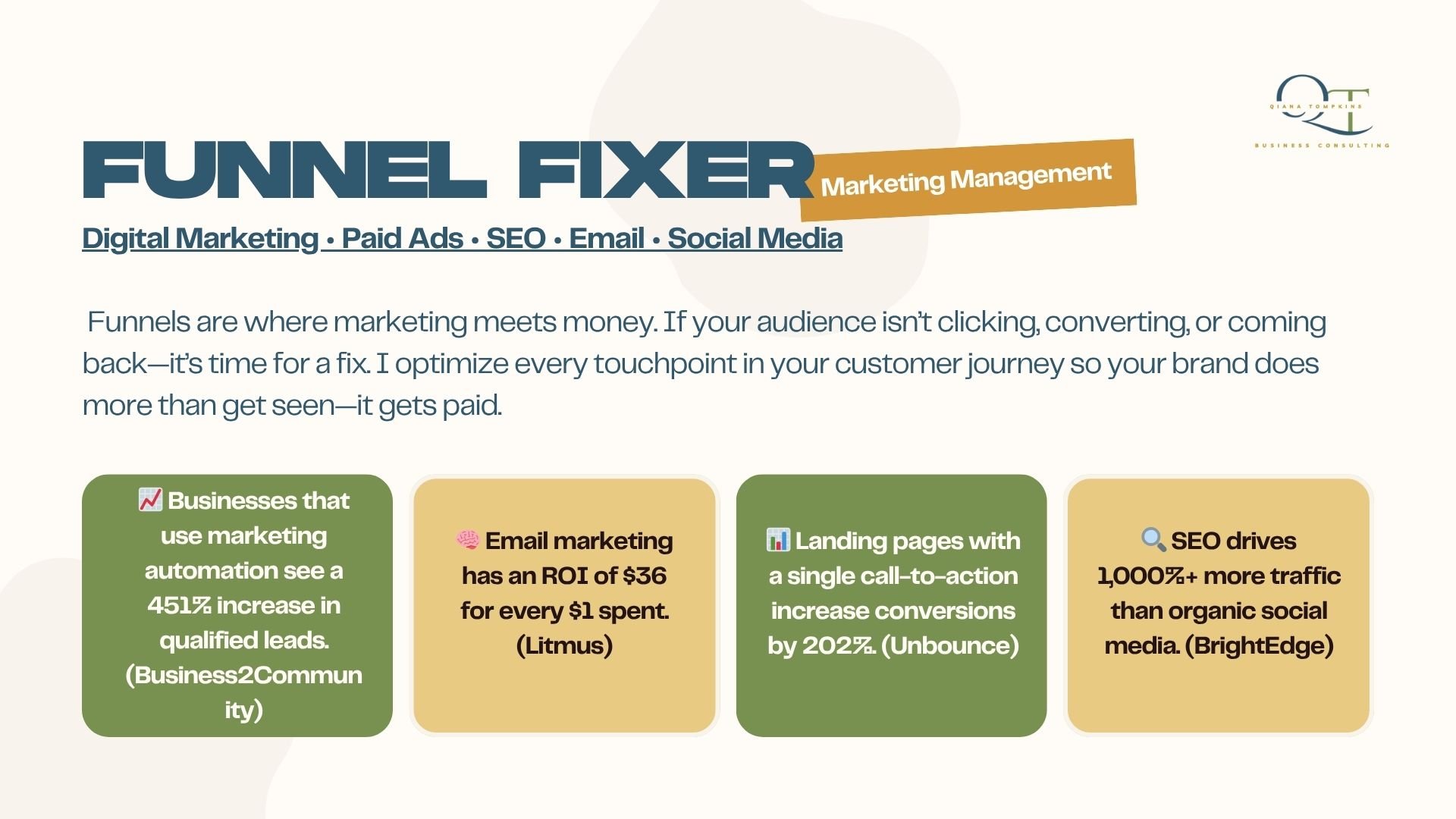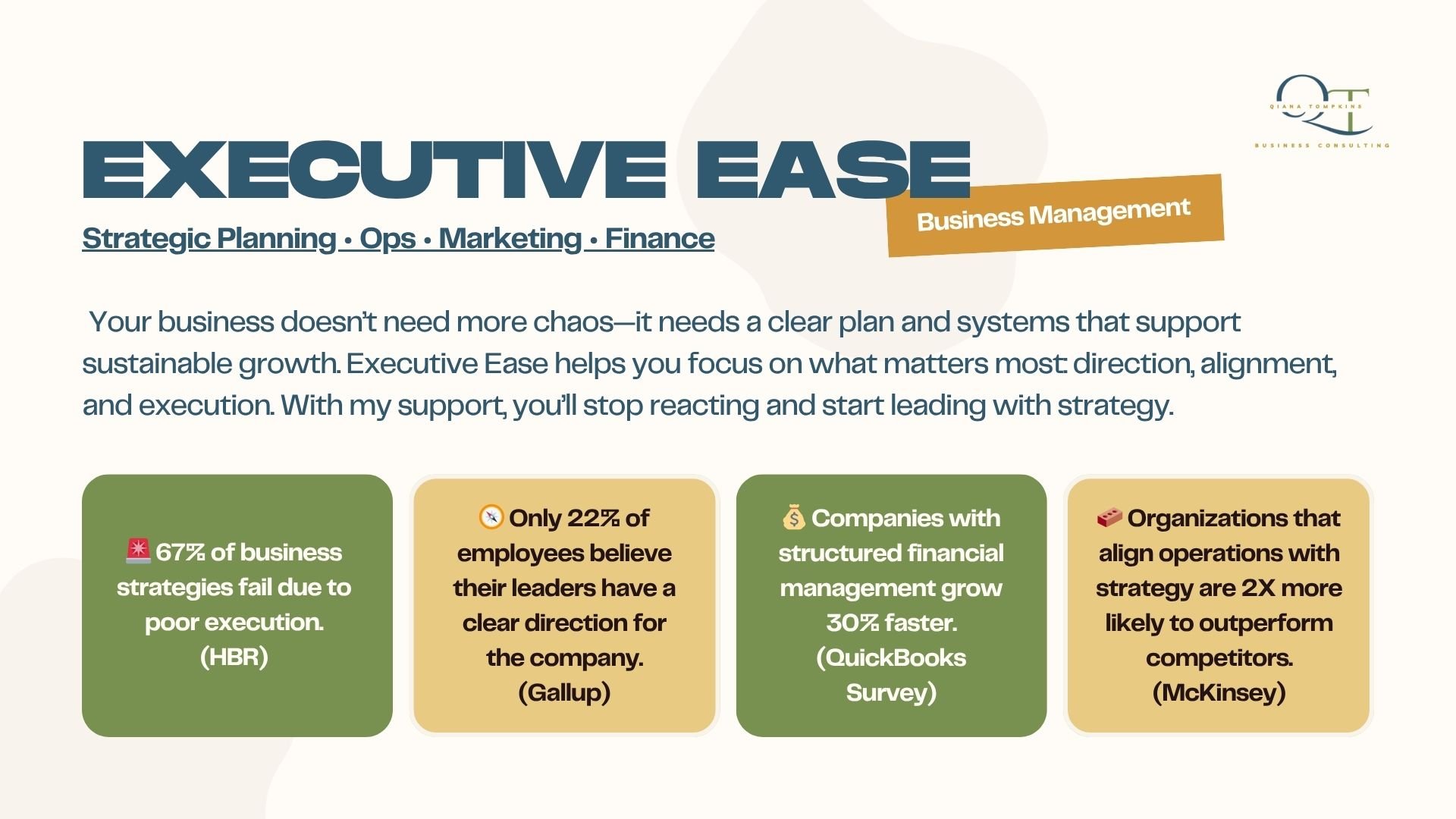 I specialize in helping e-commerce and service-based entrepreneurs like coaches, consultants, creatives, and experts, who are ready to scale without burning out. If you're tired of winging it and want a sustainable structure, you're my kind of client.